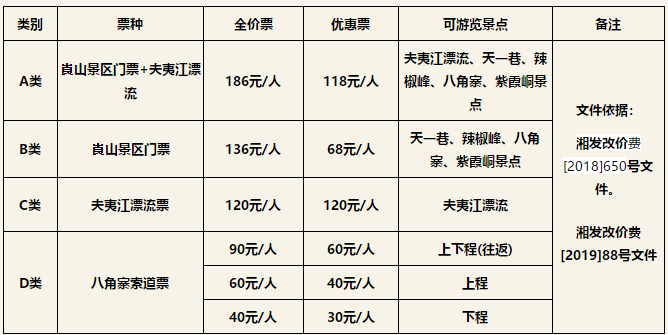 1、14周岁(不含14周岁)以下的儿童、65周岁(含65周岁)以上老年人、残疾人、现役军人、军队离退休干部凭有效证件可享受免票(夫夷江漂流、八角寨索道、旅游观光车等项目需另行购票)。