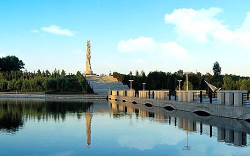 公园内自然地形起伏变化与其天然的碧水,是难得的雕塑公园环境。规划采用中国传统与西方造园学说和现代规划理念相结合的构思,达到了自然与人文的和谐统一,主入口大门及两侧弧形引导墙,沿中轴线对称布局相得益彰;不对称的景观广场,运用巧妙的轴线转折,通过拱形桥与主题雕塑遥相呼应。蜿蜒变化的一、二号园路,似玉带沿碧波粼粼的湖水环绕,与四组景观长墙巨龙般倾向湖心的喷水,形成动与静、真与曲的韵律美。