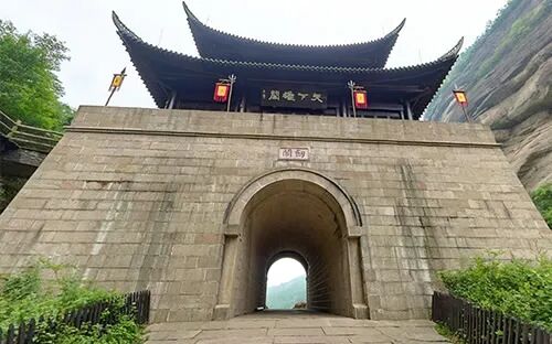 剑门关,位于四川省剑阁县城南15公里处,地处四川盆地北部边缘断褶带,大、小剑山中断处,两旁断崖峭壁,峰峦似剑,两壁对峙如门,故称“剑门”,是我国最著名的天然关隘之一,享有“剑门天下险” 、“天下第一关”、“蜀之门户”之美誉。三国蜀汉丞相诸葛亮曾在此修筑栈道30里,设关守卫,称“剑阁”。唐代诗人李白《蜀道难》:“剑阁峥嵘而崔嵬,一夫当关,万夫莫开”的赞誉更让剑门关名扬海内。1982年被国务院列为首批国家重点风景名胜区;2010年9月被列为国家AAAA级风景区。