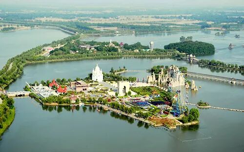 旅游区总占地15.8平方公里,分为鸟语林、西区、东区,十二花岛、明清苑五大景点。碧波万顷,风光旖旎,古色古香,让人如痴如醉。景区融中西建筑于一体,尽现建筑文化和园林文化的魅力。游客在此可行走栈桥,览万顷碧波于脚下;可乘坐舟船,赏十二花岛于四时;可进明清古宅,赏砖瓦缝合、斗拱飞檐。