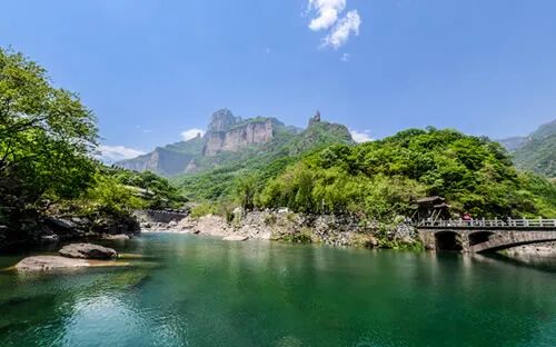 一湾碧水、两溪交汇指的是八里沟与西莲沟的两条溪流在此处汇流成凤凰湾。三组古建指的是由桥头堡、二仙桥、山门服务楼组成的汉唐建筑群和明清建筑的八里沟大酒店以及太行石屋式建筑。
