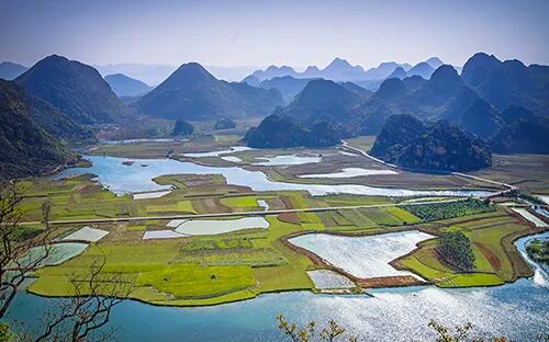 文山州丘北普者黑景区,壮文名称为 Oengz Liuhdoz Lueg Canghngw,音译为"泸尚阁"。其位于云南省文山壮族苗族自治州丘北县境内,距县城13公里,是国家级风景名胜区、国家AAAA级旅游景区。景区总面积388平方公里,核心景区165平方公里,属于滇东南岩溶区,是发育典型的喀斯特岩溶地貌,以“水上田园、湖泊峰林、彝家水乡、岩溶湿地、荷花世界、候鸟天堂”六大景观而著称。
