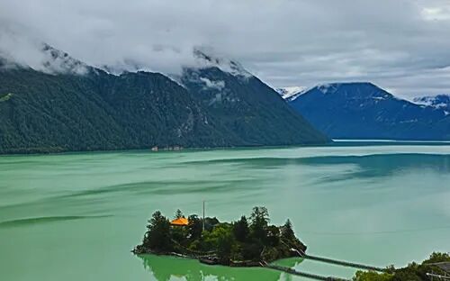 不同于西藏其他的神湖,巴松措(又名措高湖,藏语意为“三岩三湖”)完全被郁郁葱葱的原始森林所包围,好像一座原生态博物院,确实如它的名字般,巴松措是绿色的,是那种淡淡的玉石般没有杂质的绿色。湖水清澈得可以看见两三米下成群游动的鱼儿。四周青山如黛,顶峰是终年不化的积雪。湖边的雪山和湖面倒映的雪山彼此纠缠着,连绵不绝,很是壮观!最难得的是,现在还很少有人到这里,完全一副与世隔绝的模样。