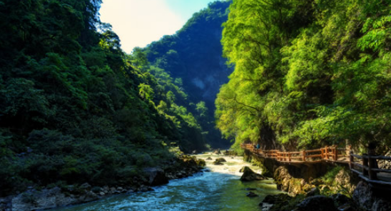卧龙谷是鸳鸯湖与卧龙潭之间的一段明流,因水质好且能吸收折射较多蓝光绿光,故多呈蓝绿色,清如明镜,群山树映。卧龙谷漂游从卧龙潭出发沿溪而下直至鸳鸯湖上湖。荡舟前行,溪流忽时而狭窄,时而宽阔,一道道绿荫幽深的水上长廊,一汪汪清澈见底的深塘,更有河中小岛如盆盆花木盆景屹立在水的中央。