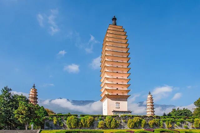 崇圣寺三塔文化旅游区位于中国云南省大理州境内大理古城北,是集苍洱风光、文物古迹、佛教文化、休闲度假为一体的国家5A级旅游景区。景区中的崇圣寺三塔为大理的标志和象征。三塔由一大二小三阁组成,大塔又名千寻塔,当地群众称它为“文笔塔”,通高69.13米,底方9.9米,凡16级,为大理地区典型的密檐式空心四方形砖塔;南北小塔均为十级,高42.17米,为八角形密檐式空心砖塔。【 详细>>】