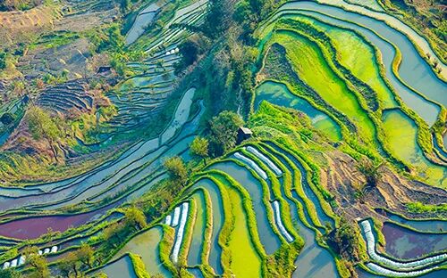 元阳梯田,位于云南省红河州元阳县的哀牢山南部,是哈尼族人世世代代留下的杰作。元阳梯田是红河哈尼梯田的核心区。红河哈尼梯田是以哈尼族为主的各族人民利用特殊地理气候同垦共创的梯田农耕文明奇观,规模宏大,气势磅礴。元阳哈尼族开垦的梯田随山势地形变化,坡缓地大则开垦大田,坡陡地小则开垦小田,甚至沟边坎下石隙也开田,因而梯田大者有数亩,小者仅有簸箕大,往往一坡就有成千上万亩。