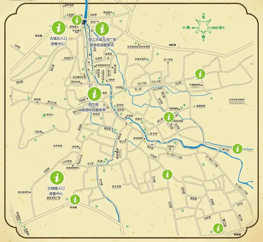 古城南大门→七一街八一下段→南门桥逆流而上→署古井→万子桥→百岁桥→大石桥→卖鸡豆桥→东大街→大水车→玉龙桥→玉河走廊→黑龙潭