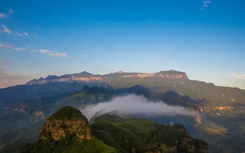 金龟朝阳是西坡绝壁与山上的缓坡构成的奇妙景观。缓坡为大小两山,大坡恰似椭圆形的龟背,极为饱满,小坡较为狭长,很像龟的头部前伸,而绝壁正好构成了龟板的边缘,体型硕大,“龟体”高约300米,长约500米。每当夕阳西下,斜日余晖映照在绵长的绝壁上,就闪射金光,所以叫做金龟朝阳。