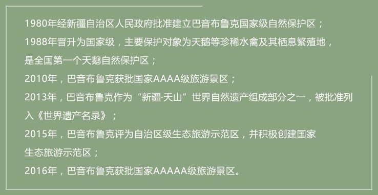 巴音布鲁克景区位于新疆巴音郭楞蒙古自治州和静县西北部,由天鹅湖景点(核心景观区)、游览区以及巴音布鲁克镇区三部分组成,面积1259.47平方公里,平均海拔2000-2500米,四周山体海拔3000米以上。2016年10月14日,新疆自治区巴音州和静巴音布鲁克景区被国家旅游局评为国家5A级旅游景区。