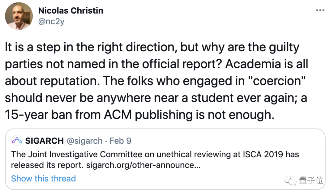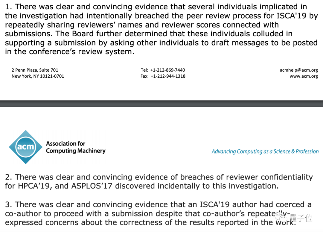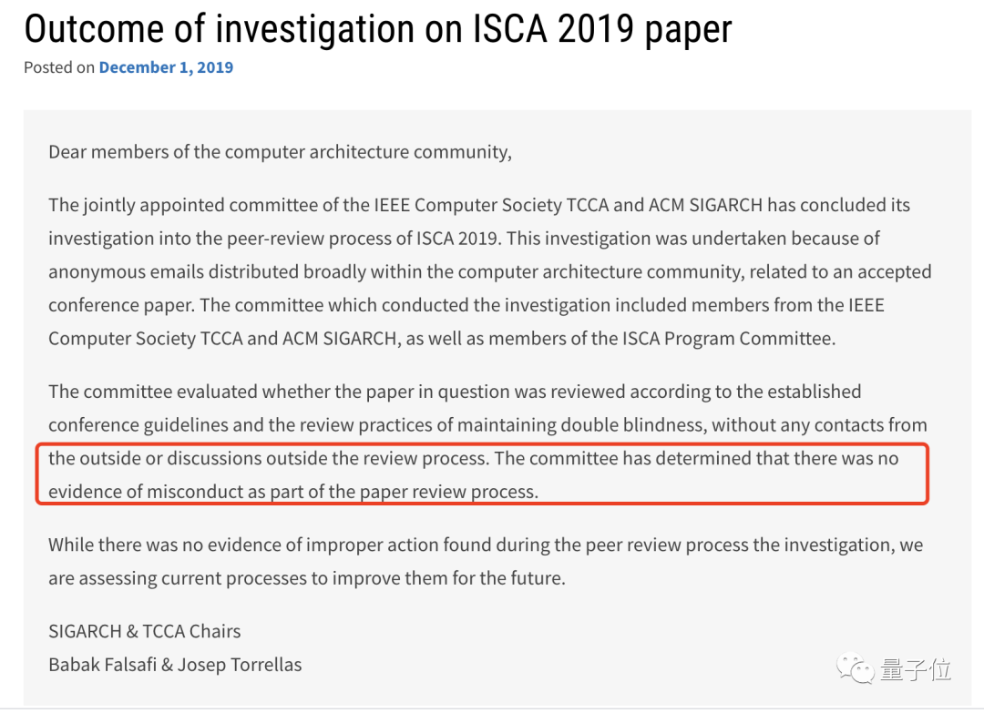 有明确且令人信服的证据表明 ,调查中牵涉到的几个人故意违反ISCA-2019的同行评审程序,反复分享与投稿相关的评审人姓名和评审人分数。委员会还确定,这些人串通一气,要求其他人起草信息,张贴在会议的审查系统中,以支持提交的材料。