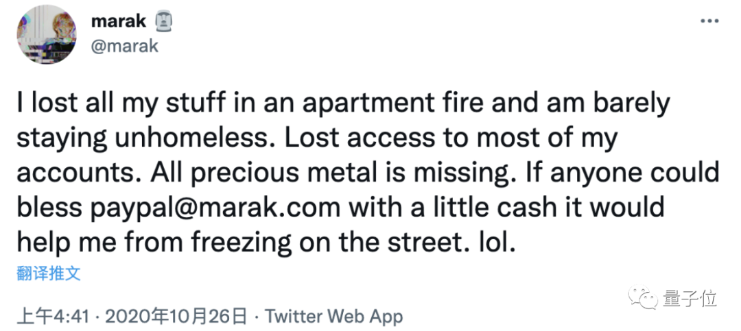 在Marak因公寓失火涉嫌制造炸弹事件被捕的一个多月后,曾因无家可归在Twitter发帖请求网友捐款接济。