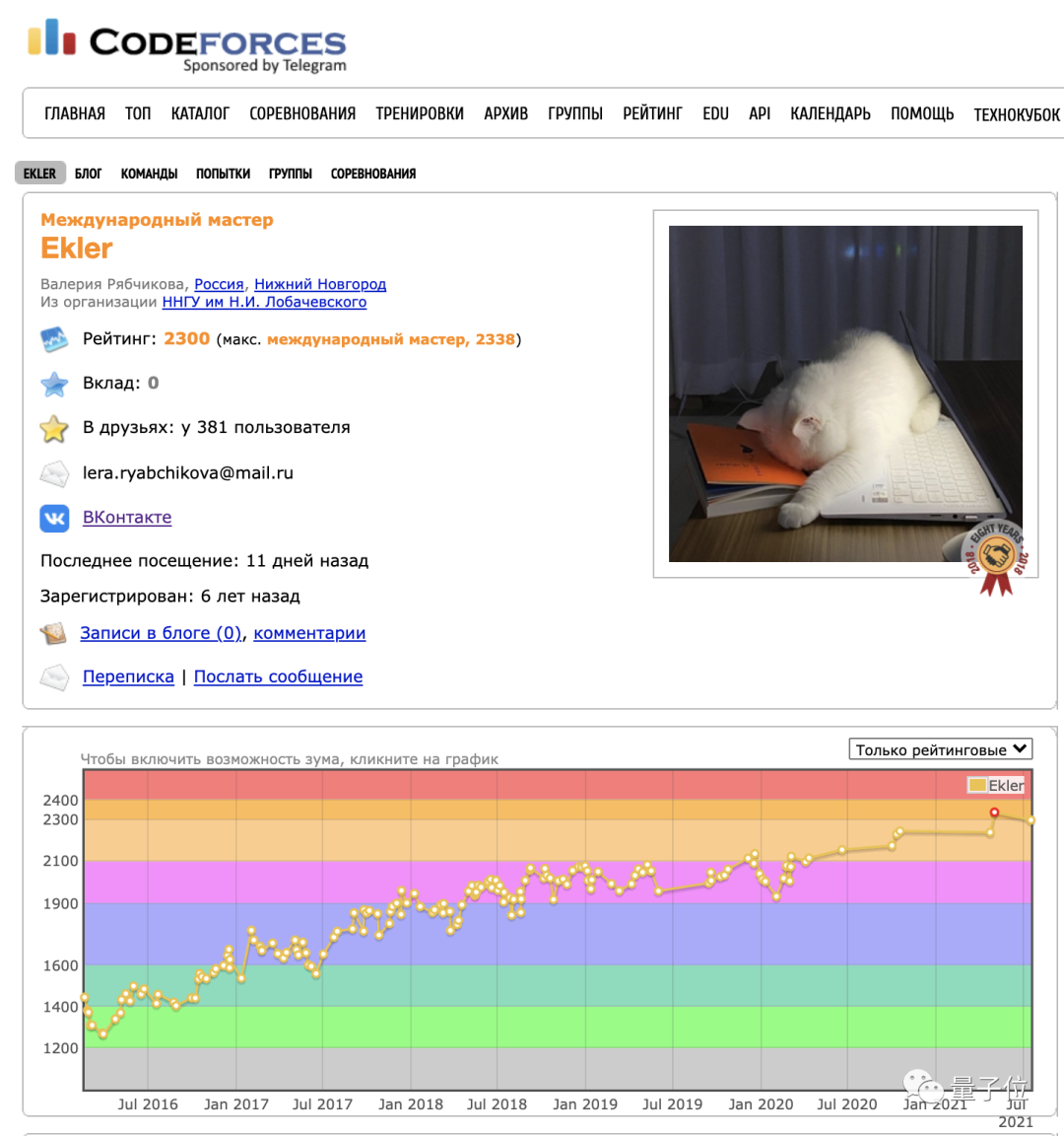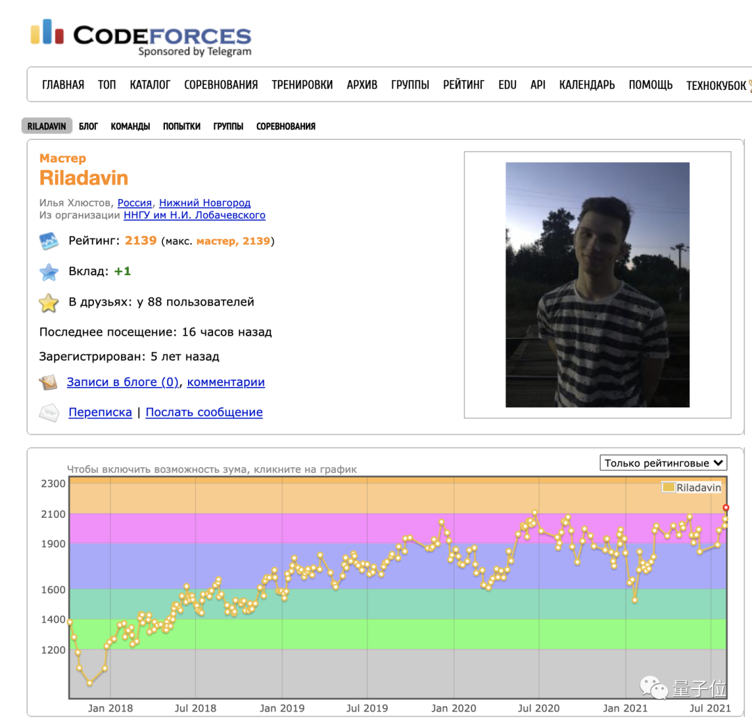 他和瓦莱里娅有着非常相似的经历,也是从“高中时期”开始在Codeforces上锻炼刷榜,截止到目前为止共刷了2139分。