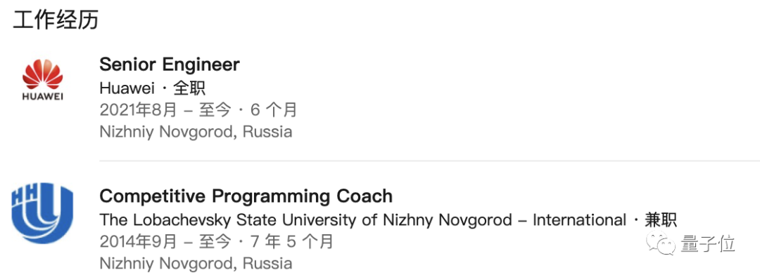 而在2021年的8月份,团队教练Shmelev Alexey正式成为了华为下诺夫哥罗德研究所的一名高级工程师: