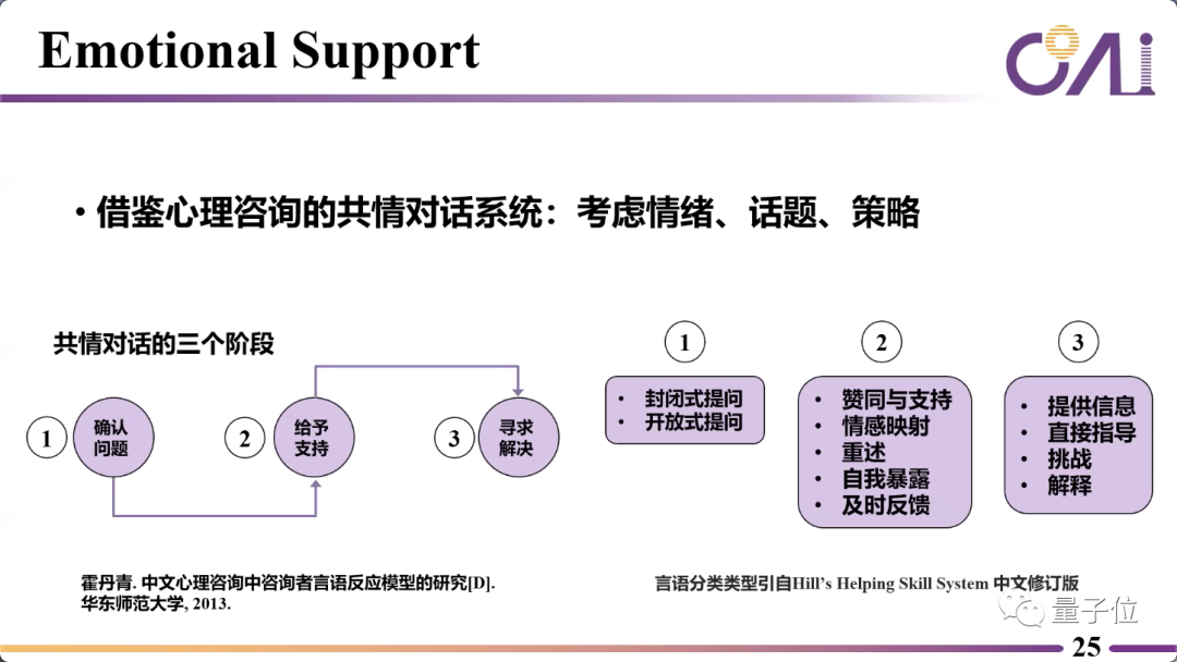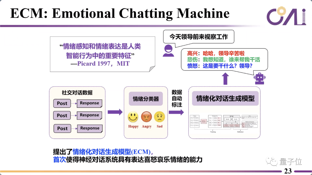 还提出情绪对话生成模型,可以让对话系统能表达喜怒哀乐。同时又借鉴了心理咨询的理论和方法,使对话系统有情感、有温度,能进行情绪支持和社交支持。