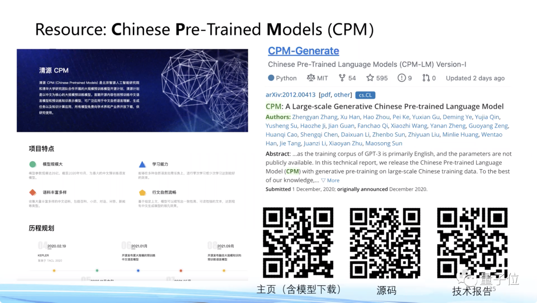 最后,刘知远介绍了与黄民烈老师及多方团队合作在北京智源研究院算力支持下开发的中文预训练语言模型“清源CPM”。该项目已在GitHub上开源,感兴趣的话可以扫描下图二维码获取。