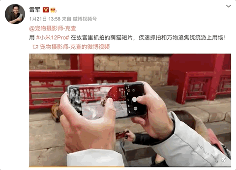 像小米12 Pro的“万物追焦”,一举成为铲屎官心头好,就算宠物跑出画面,也能自动对回焦,雷军看了都要激情转发: