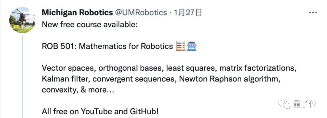 密歇根安娜堡分校机器人学院开放了核心课程:Robotics 501: Mathematics for Robotics。