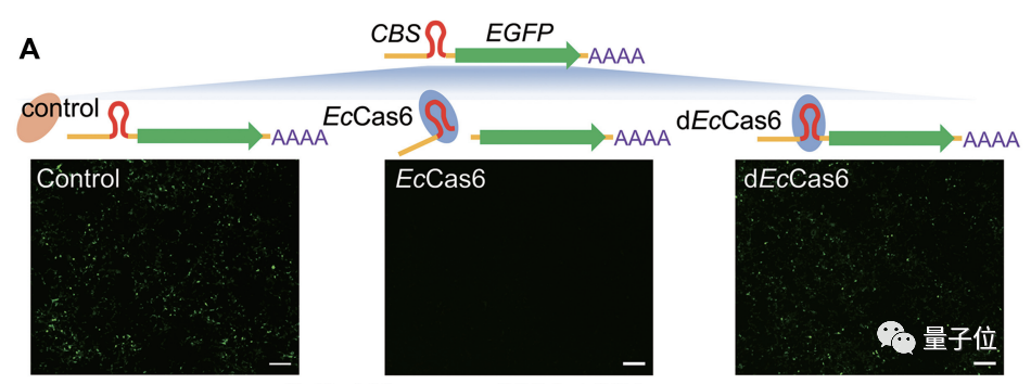 在后续实验中,韩春雨团队证明,Cas6FC具有高度的敏感性,只需要在目标RNA上标记一个反应原件,就能“打开”Cas6FC荧光开关,从而“点亮”RNA。