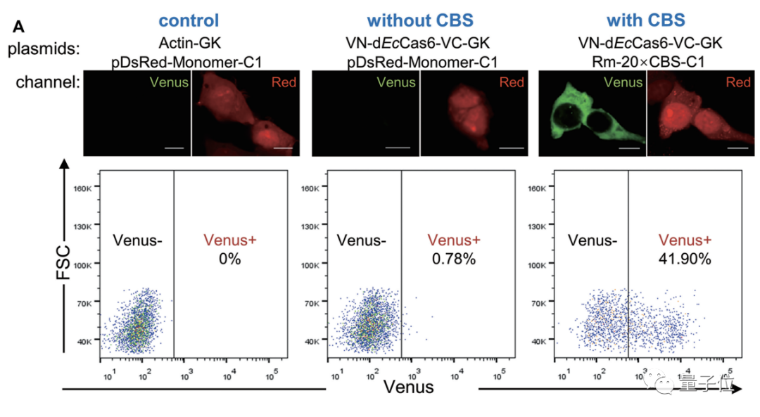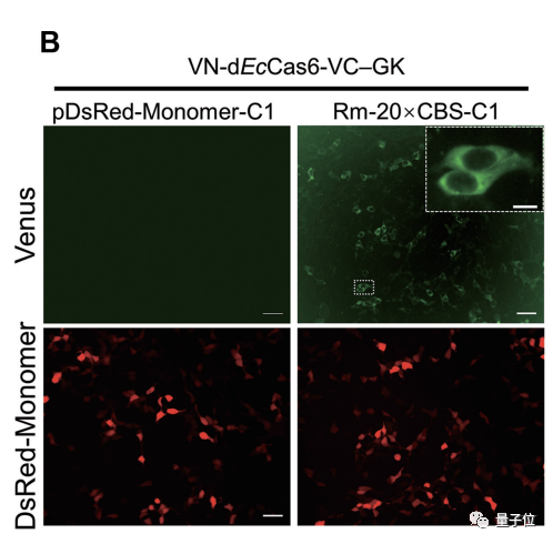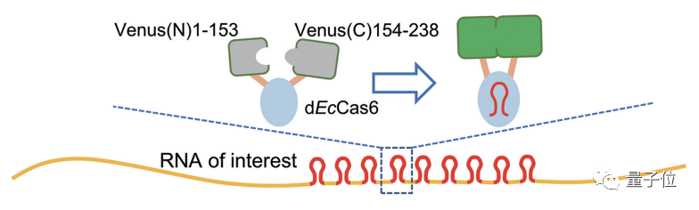 然后,在EcCas6蛋白N端和C端分别融合被分割开的荧光蛋白片段(Split Venus),得到一个新的嵌合体示踪蛋白:VN-dEcCas6-NC。