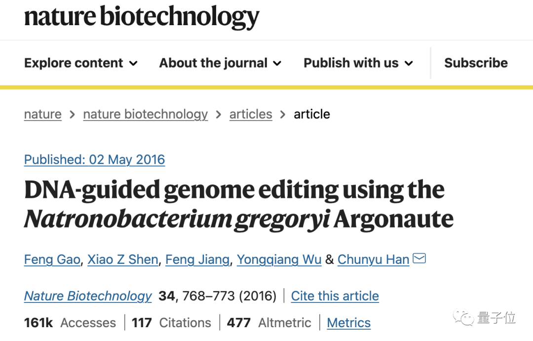在这一天,顶刊Nature Biotechnology发表了韩春雨的一篇研究,名为DNA-guided genome editing using the Natronobacterium gregoryiArgonaute。