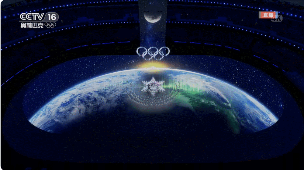 而在点火仪式上,巨型雪花屏由中心向四周辐射开来。