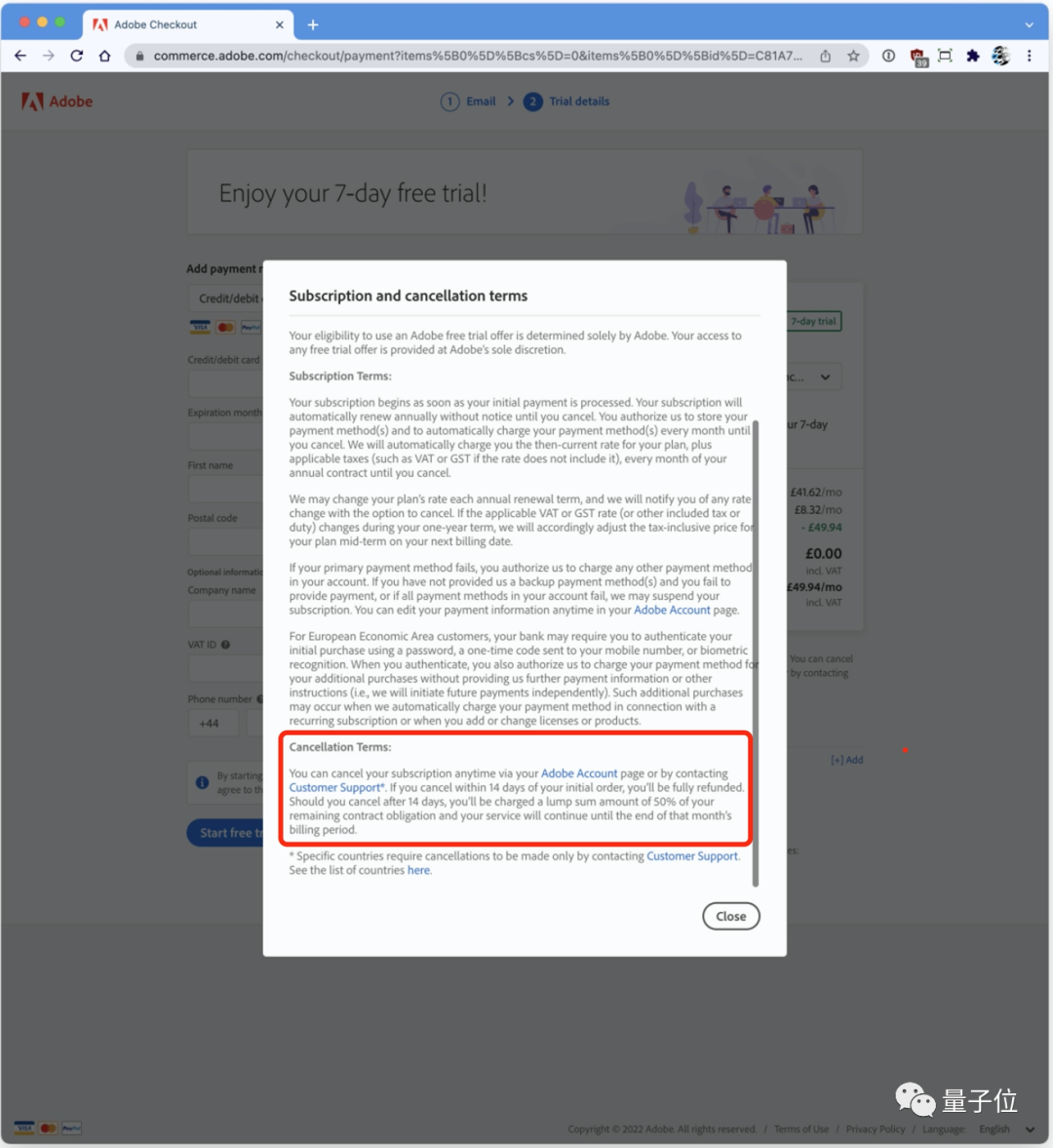 翻译过来就是,假设你在免费试用7天后支付了第一个月的费用,结果想在第一个月月底取消订阅这份计划时,所需支付的费用将不只是49.94英镑(折合人民币约429元),而是将近300英镑 (约2581元)。