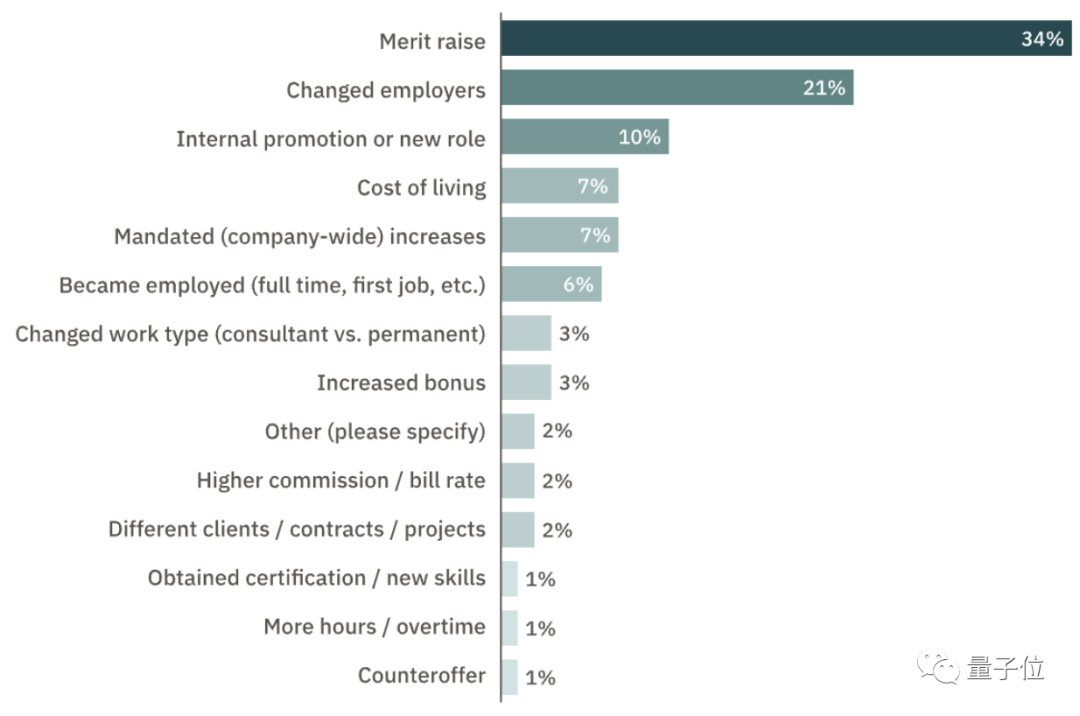 然而,大家涨薪的原因并非来源于跳槽,而是调薪(Merit raise),占比高达34%,至于跳槽和内部晋升分则分别占第二、三名。