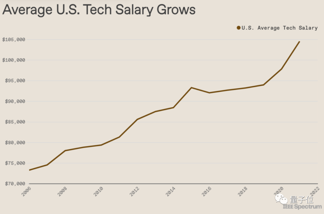 据IEEE Spectrum报道,2021年全美技术人员的平均年薪上涨了6.9%,从五位数(97859美元,约62万人民币)突破到了六位数:104566美元(约66万人民币)。