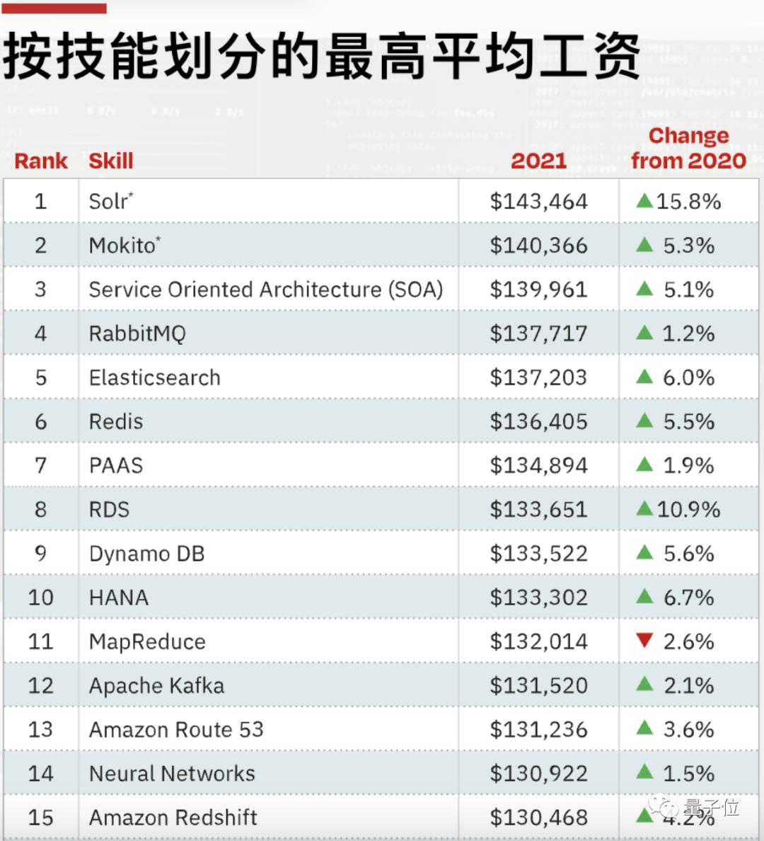 在计算机领域,有些技能薪酬特别高,排名前三的分别是:Solr、Mokito和SOA(面向服务架构),平均薪资已达14万+美元(约合人民币89万)。