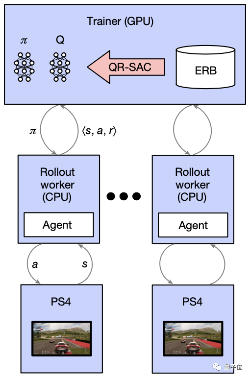 在GT游戏中,研究这种通常使用10到20台PS游戏机、同等数量的计算实例、一台异步更新神经网络的GPU,从头开始训练这个叫做GT Sophy的AI。