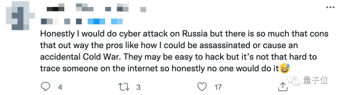 对此有网友表示,即使有意愿对俄罗斯进行网络攻击,需要考虑的事情也太多了,估计最后也没人愿意参与做这事儿。