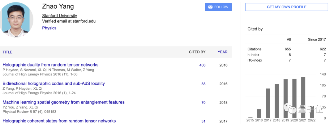 谷歌学术显示,其引用次数最高的一篇论文为《随机张量网络的全息对偶性》(Holographic duality from random tensor networks),有406次。