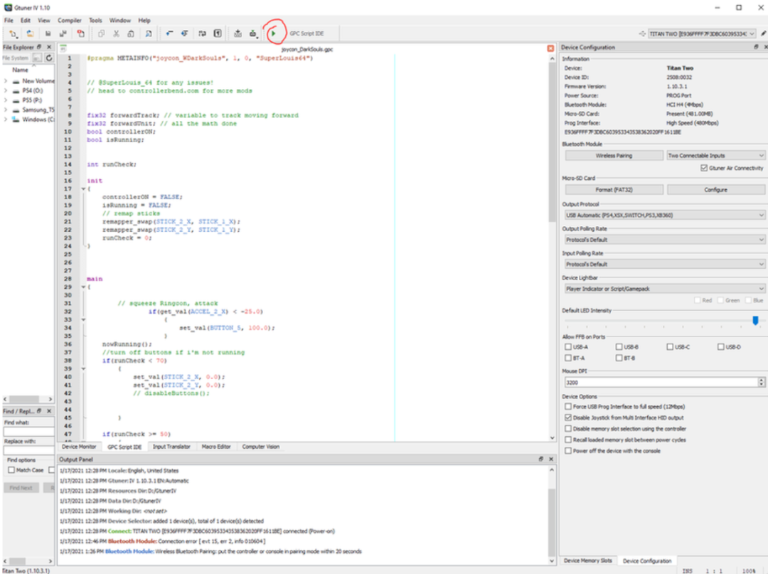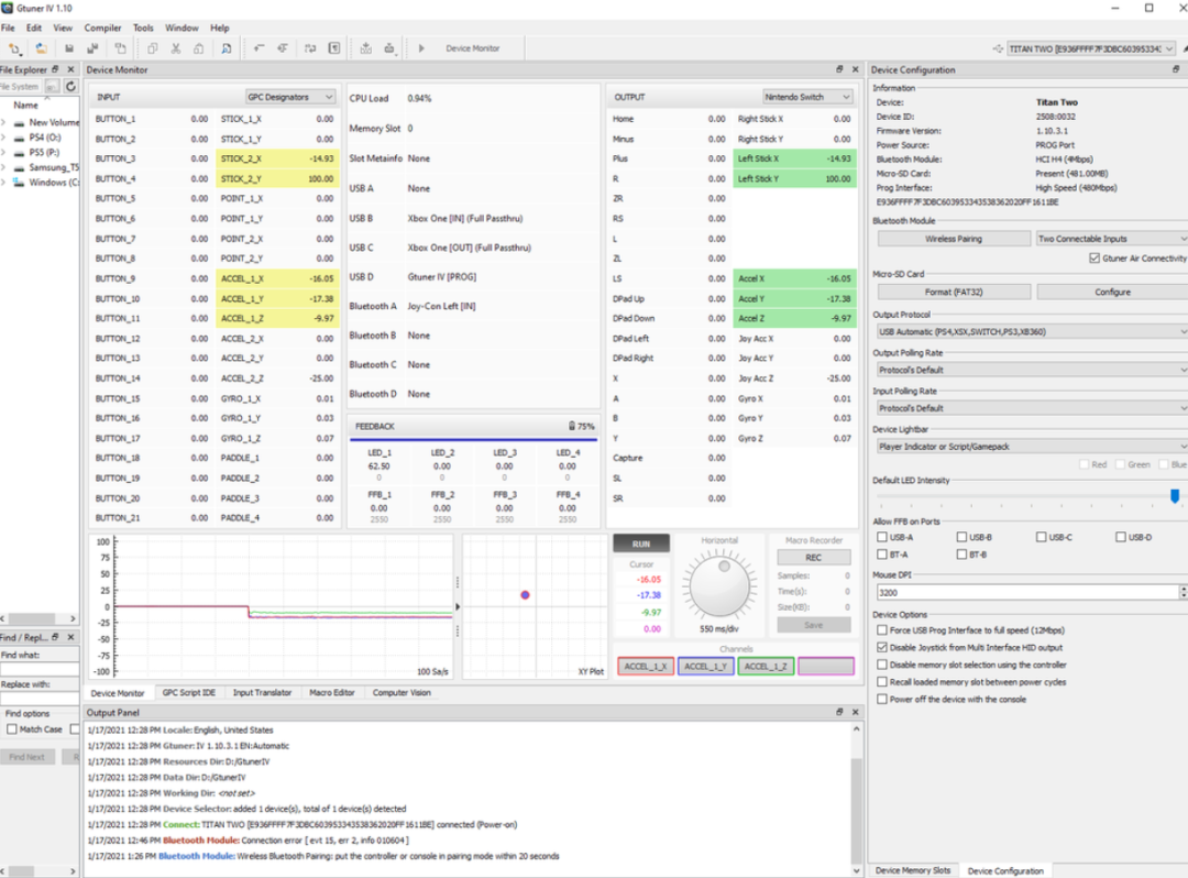 打开GTuner IV软件,将蓝牙模块装如Titan 2中,再把Titan 2的输出与编程接口连接到PC,在将手柄以有献方式连接到Titan 2的B插口。