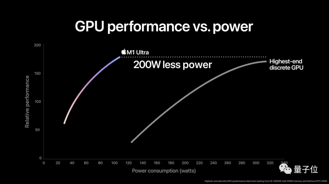 GPU方面,苹果将M1 Ultra和英伟达RTX 3090相比,结果证明它在运行速率超过3090的同时,还能将功耗降低200瓦。