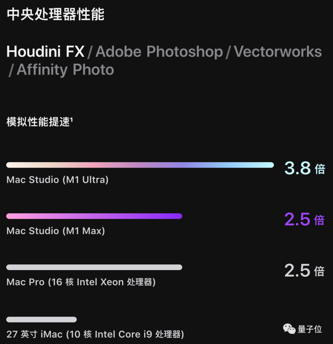 CPU方面,搭载M1 Ultra的Mac Studio较10核Intel版27寸iMac相比,模拟性能提速可达3.8倍;M1 Max版也能提速2.5倍。