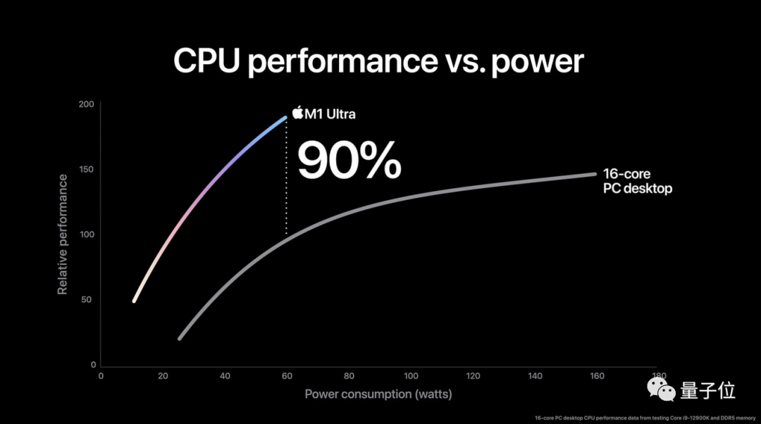 CPU方面,同等功率下,M1 Ultra比Intel i9-12900k的最佳性能,还要高出90%。