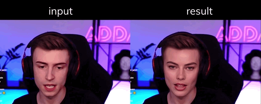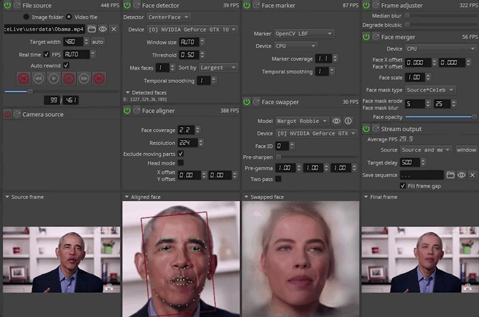 这是一个去年刚刚公开的开源工具,特点是可以在流媒体或直播视频中实时换脸,也就是说让用户通过网络摄像头应用面部过滤器,与大多数基于视频的流媒体和信息服务结合使用。