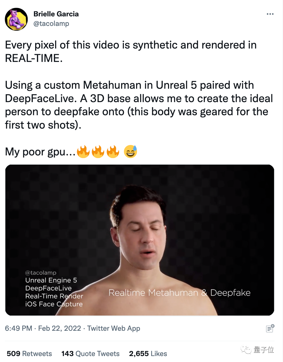 横山提到,他在几天前看到有人将UE5和DeepFace Live结合起来,直接合成了一个视频: