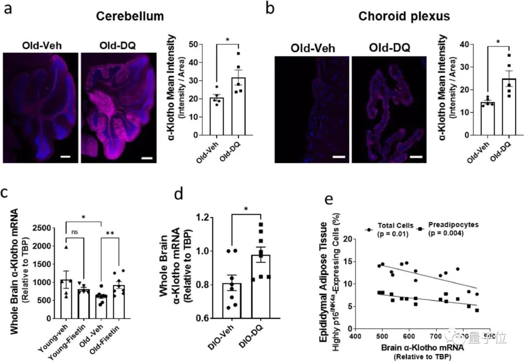 (如下图a和b对比,亮色越明显表示α-Klotho含量越高;DQ表示使用了达沙替尼+槲皮素药物,这二者均为Senolytics药物)