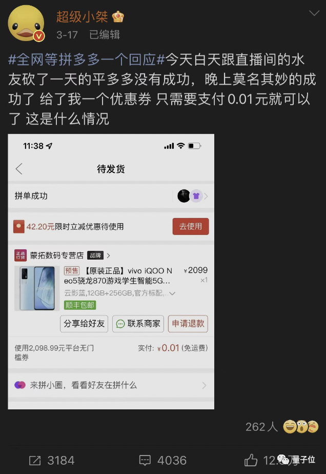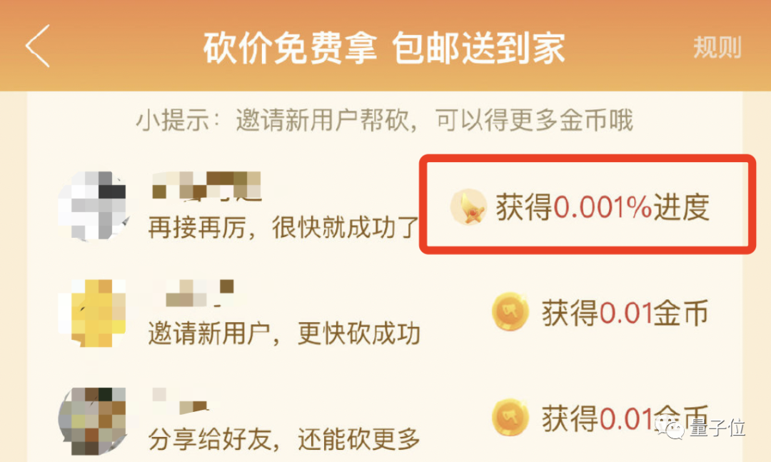 而当时,拼多多的回应是,砍价页面显示的0.9%不是0.9%,而是0.9996427%。