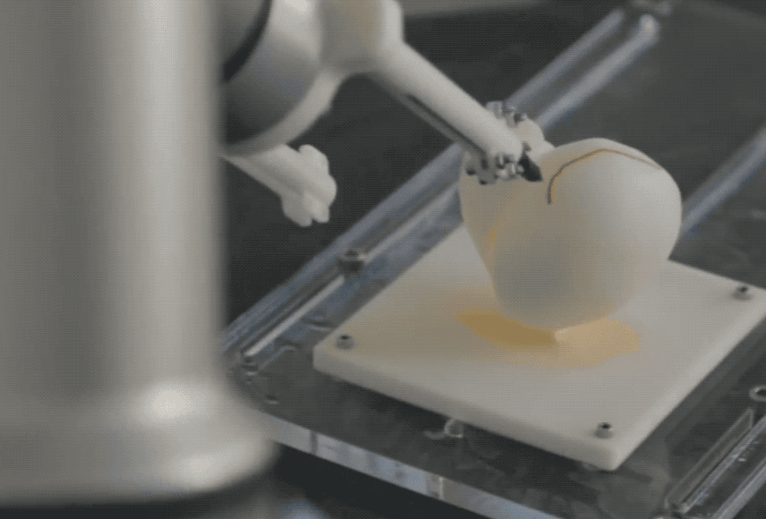 为此,本次研究中,科学家们抛弃传统的3D打印机,用六轴机器人改造了一个可以360度自由转动的全新工具,对细胞进行全方位打印。