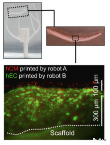 最终,打印出的完整内皮层,可在生血管因子的辅助下生长出新血管和毛细血管网络;打印的心肌细胞也能在很快形成间隙连接,维持6个月的规律性搏动。