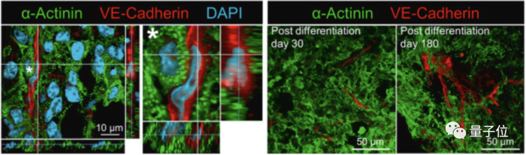以及打印细胞分化后第30天和第180天检测到的心肌细胞(α-Actinin)和内皮细胞(VE-cadherin)结构。