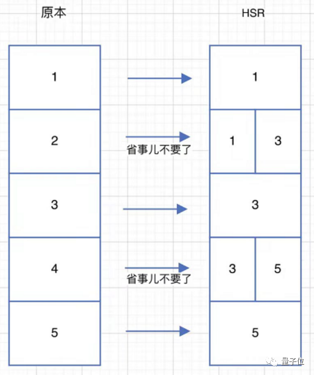 HSR技术还要更精细一些,没有直接将每两行并成一行扫描,而是在偶数行上,一半时间显示上一行数据,一半时间显示下一行数据,例如第二行显示的是1+3行的数据: