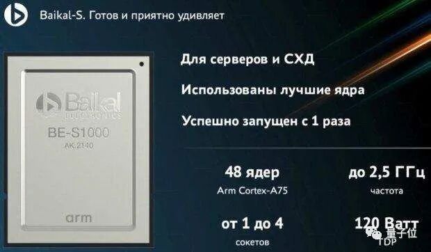 其最近发布的处理器为Baikal-S,拥有48个核心,基准频率2.0GHz,最高加速2.5GHz,热设计功耗为120W,同时还整合封装了一颗自研的RISC-V架构协处理器。