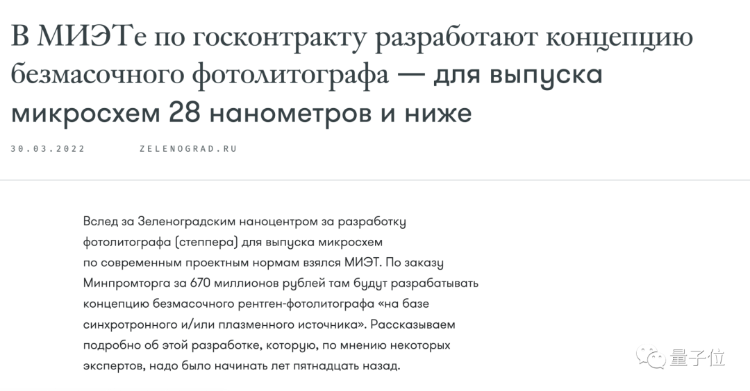 参考链接:[1]https://www.reuters.com/technology/russia-turns-china-microchips-in-demand-domestic-bank-cards-2022-04-05/[2]https://www.datacenterdynamics.com/en/news/intel-and-amd-halt-chip-sales-to-russia-tsmc-joins-in-on-sanctions/[3]https://www.bloomberg.com/news/articles/2022-03-30/russia-s-internet-giant-may-run-out-of-tech-it-needs-in-a-year[4]https://en.wikipedia.org/wiki/Angstrem_(company))[5]https://en.wikipedia.org/wiki/National_Research_University_of_Electronic_Technology[6]http://ipmras.ru/en/structure/people/salashch[7]https://www.zelenograd.ru/hitech/v-miete-razrabotayut-koncepciyu-bezmasochnogo-fotolitografa-dlya-vypuska-mikroshem/[8]https://www.zelenograd.ru/hitech/v-zelenogradskom-nanocentre-startovala-razrabotka-otechestvennogo-fotolitograficheskogo-oborudovaniya/[9]http://www.kkg.com.cn/shownews.asp?newsid=2955[10]https://fanpusci.blog.caixin.com/archives/253286[11]https://stimul.online/articles/science-and-technology/fotolitografiya-s-pyatnadtsatiletnim-opozdaniem/