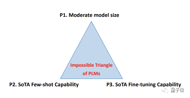 论文提出,目前的预训练语言模型对于模型规模、精调能力、小样本能力三者不可兼得。