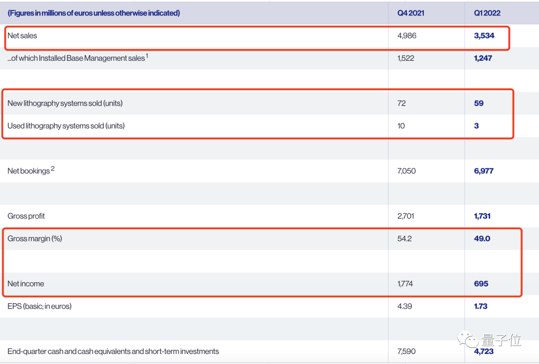 ASML刚刚发布的Q1季度财报显示,其第一季度共卖出59台新光刻机,3台二手光刻机,净销售额为35亿欧元,净收入为6.95亿欧元,毛利率为49.0%,整体较2021年Q4季度有所下降。