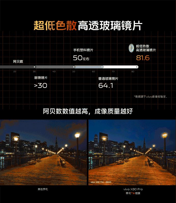 其中玻璃镜片阿贝数达到了81.6*(数值越高,成像质量越好),日常手机塑料镜片,阿贝数也只在50左右。