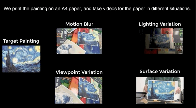 第一步,将这幅画打印在A4纸上,然后录制视频。在不同角度、光照、抖动情况下捕捉纸张,并从中提取帧。